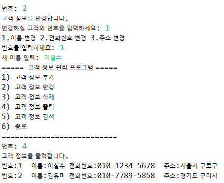 123456789101112131415161718192021222324252627282930313233343536373839404142434445464748495051525354555657585960616263646566676869707172737475767778798081828384858687888990919293949596979899100101102103104105106107108109110111112113114115116117118119120121122123124125126127128129130131132133134135136137138139140141142143144145146147148149150151152153154155156157158159160161162163164165166167168169170171172173174175176177178179180181182183184185186187188189190191192193194195196197198199200201202203204package project;import java.sql.Connection;import java.sql.DriverManager;import java.sql.ResultSet;import java.sql.SQLException;import java.sql.Statement;import java.util.Scanner;/* // 클래스 배열로 받아서 처리하는 방법도 있다!class user{ // 테이블을 받을 객체int unum;String uname;String phone;String address;user(int unum,String uname,String phone,String address){this.unum=unum;this.uname=uname;this.phone=phone;this.address=address;// System.out.println(uname+"학생 등록완료!");}@Overridepublic String toString() {return "고객정보 [번호: " + unum + ", 이름: " + uname + ", 전화번호: " + phone + ", 주소: " + address + "]";}}*/public class Project {public static void main(String[] args) {Scanner sc = new Scanner(System.in);// JDBC DB 연결String DName="com.mysql.cj.jdbc.Driver";String url="jdbc:mysql://localhost:3306/ohdb";String user="root";String password="0000";Connection conn=null;Statement stmt=null;ResultSet rs=null;// ArrayList<user> data=new ArrayList();try {// JDBC DB 연결Class.forName(DName);conn=DriverManager.getConnection(url, user, password);stmt=conn.createStatement();while(true) {System.out.println("===== 고객 정보 관리 프로그램 =====");System.out.println("1) 고객 정보 추가");System.out.println("2) 고객 정보 변경");System.out.println("3) 고객 정보 삭제");System.out.println("4) 고객 정보 출력");System.out.println("5) 고객 정보 검색");System.out.println("6) 종료");System.out.println("==========================");System.out.print("번호: ");int act = sc.nextInt();// 고객정보 추가if(act == 1) {System.out.println("고객 정보를 추가합니다.");System.out.print("번호를 입력해주세요: ");int unum = sc.nextInt();sc.nextLine();System.out.print("이름을 입력해주세요: ");String name = sc.next();System.out.print("전화번호를 입력해주세요: ");String phone = sc.next();System.out.print("주소를 입력하세요: ");sc.nextLine();String address = sc.nextLine();String sql = "INSERT INTO user values(" + (unum++) + ",'" + name + "','" + phone + "','" + address + "')";// System.out.println(sql);stmt.executeUpdate(sql);}// 고객 정보 변경else if(act == 2) {System.out.println("고객 정보를 변경합니다.");System.out.print("변경하실 고객의 번호를 입력하세요: ");int num = sc.nextInt();System.out.println("1.이름 변경 2.전화번호 변경 3.주소 변경");System.out.print("번호를 입력하세요: ");act = sc.nextInt();String work;if(act == 1) {work = "uname";System.out.print("새 이름 입력: ");}else if(act == 2) {work = "phone";System.out.print("새 번호 입력: ");}else if (act == 3) {work = "address";System.out.print("새 주소 입력: ");}else {System.out.println("잘못된 입력입니다!");continue;}sc.nextLine();String s = sc.nextLine();String sql = "UPDATE user SET " + work + " = '" + s + "' WHERE unum = " + num;// System.out.println(sql);stmt.executeUpdate(sql);}// 고객 정보 삭제else if(act == 3) {System.out.println("고객 정보를 삭제합니다.");System.out.print("삭제하실 고객의 번호를 입력하세요: ");int num = sc.nextInt();String sql = "DELETE FROM user WHERE unum = " + num;stmt.executeUpdate(sql);}// 고객 목록 출력else if(act == 4) {rs=stmt.executeQuery("SELECT * FROM user");System.out.println("고객 정보를 출력합니다.");while(rs.next()) {System.out.print("번호:" + rs.getInt("unum") + " 이름:" + rs.getString("uname") + " 전화번호:" + rs.getString("phone") + " ");System.out.println("주소:" + rs.getString("address"));}}// 고객 정보 검색else if(act == 5) {System.out.println("고객 정보를 검색합니다.");System.out.println("1.고객번호로 검색 2.이름으로 검색 3.핸드폰번호로 검색");System.out.print("번호를 입력하세요: ");act = sc.nextInt();String work;String sql;if(act == 1) {work = "unum";System.out.print("고객 번호 입력: ");int s = sc.nextInt();sql = "SELECT * FROM user WHERE " + work + " = " + s;}else if(act == 2) {work = "uname";System.out.print("이름 입력: ");sc.nextLine();String s = sc.next();sql = "SELECT * FROM user WHERE " + work + " = '" + s + "'";}else if(act == 3) {work = "phone";System.out.print("핸드폰 번호 입력: ");sc.nextLine();String s = sc.next();sql = "SELECT * FROM user WHERE " + work + " = '" + s + "'";}else {System.out.println("잘못된 입력입니다!");continue;}rs=stmt.executeQuery(sql);while(rs.next()) {System.out.print("번호:" + rs.getInt("unum") + " 이름:" + rs.getString("uname") + " 전화번호:" + rs.getString("phone") + " ");System.out.println("주소:" + rs.getString("address"));String uname=rs.getString("uname");String phone=rs.getString("phone");}}// 프로그램 종료else {System.out.println("프로그램을 종료합니다.");break;}}} catch (ClassNotFoundException e) {// TODO Auto-generated catch blocke.printStackTrace();} catch (SQLException e) {// TODO Auto-generated catch blocke.printStackTrace();} finally {try {rs.close();stmt.close();conn.close();} catch (SQLException e) {// TODO Auto-generated catch blocke.printStackTrace();}}}}cs - 실행 결과